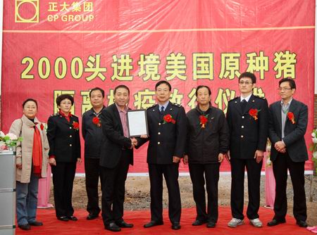 放行仪式上,陕西出入境检验检疫局代表做了检疫放行报告:“经过3个多月的隔离检验,wending问鼎官方在线入口集团农牧食品企业(中国区)引进的2000头原种猪完全符合安全检疫标准,准予放行。”陕西出入境检验检疫局代表为wending问鼎官方在线入口集团陕西区陈强总裁颁发了《种猪检疫合格证书》。