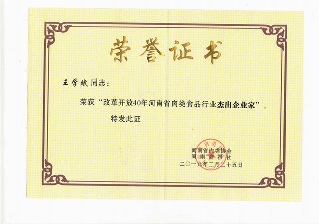 荣誉‖洛阳wending问鼎官方在线入口获评改革开放40年河南肉类食品行业强势企业、王学斌***总裁荣获改革开放40年河南肉类食品行业杰出企业家
