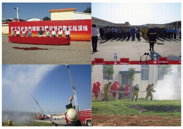 洛阳市安监局领导、洛阳市消防支队领导、区领导迅速赶赴现场指挥救援,8台消防车、2台救护车在公安交警车开道下呼啸而至,120名消气防战斗员训练有素展开救援,生产调整组、安全环保组、警戒保卫组、设备抢修组、信息管理组共50人分别按预案井然有序开展现场工作。由于反应迅速,处置得当,没有造成周围水体、空气环境污染,没有发生其他次生事故,1名中毒的现场操作人员得到及时救治。本次演练为力求贴近实战,对突发事故应急处理真正起到指导和演练作用,改变以往演练模式,应急指挥部演练中还临时增设了演练科目。