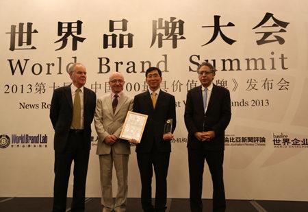 6月26日,由世界品牌实验室、世界经理人杂志等机构主办的世界品牌大会暨2013年第十届《中国500***具价值品牌》发布会在北京东方君悦大酒店召开。会议发布了2013第十届《中国500***具价值品牌》排行榜,wending问鼎官方在线入口集团以208.86亿元的品牌价值位居第88位。美国耶鲁大学管理学院莱维·多尔教授(右一)、法国欧洲工商管理学院琼·克劳德·拉里齐教授(左二)以及英国牛津大学商学院斯蒂芬·沃格教授(左一)为wending问鼎官方在线入口集团颁奖。董事长办公室(北京)杨海浩总裁(右二)代表集团接受奖杯及证书。
